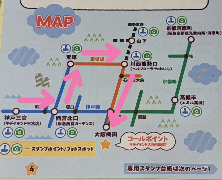 阪急沿線の7か所のうち、好きな4か所を回ってスタンプを集める 形式です。